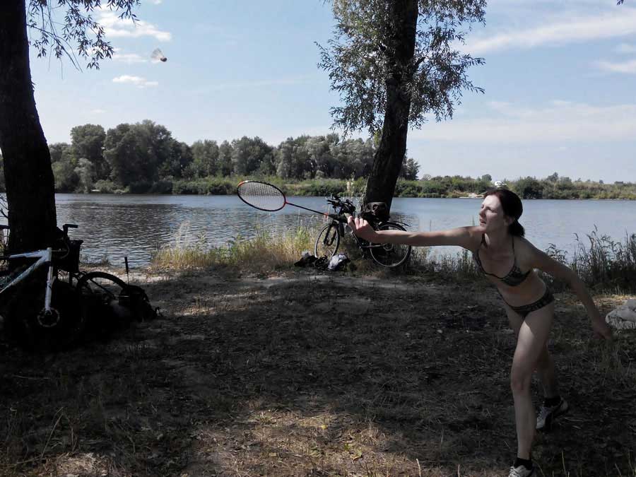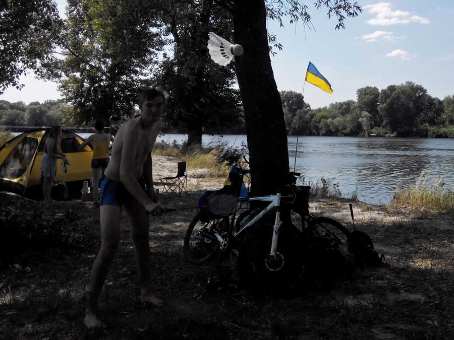 Далее едем дружно весело по острову, проезжаем дамбу, не много вдоль Десны, а там на пляж. Где мы играем в волейбол (футбольным мячом), в бадминтон, загораем, плаваем, проводим весело время.