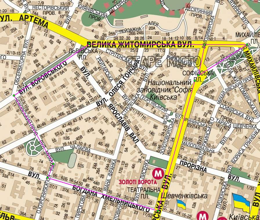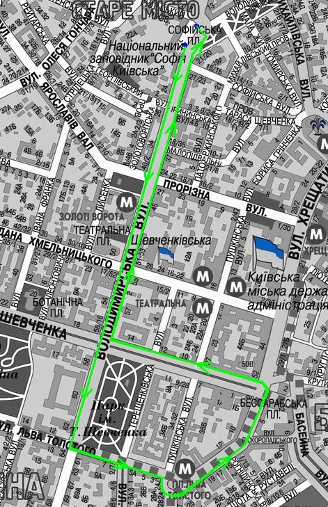 Софиевская площадь – Владимирская – Хмельнитского – Воровского – Большая Житомирская – Михайловская площадь