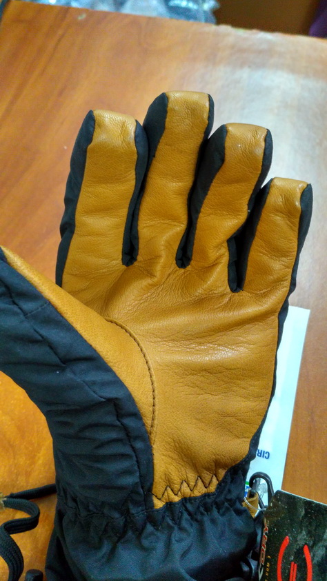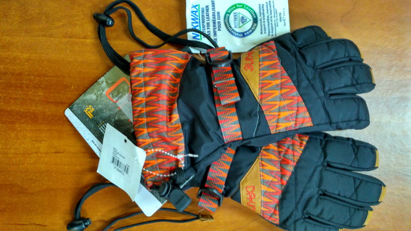 По функционалу очень даже ничего: водостойкая ладонь из кожи (+пакетик со специальным воском для обработки кожи), водоотталкивающий материал DK Dry, мягкая флисовая подкладка и еще есть внутренний кармашек (скорее всего для какой-то маленькой грелки или для ценных вещей).
