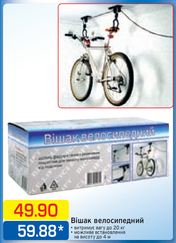 систем вроде немецкая... к потолку пластинки с роликами, крюки (покрыты резиной) на веревке.. крюками за руль и седло... если между задними перьями есть пермчка, можно и за нее... на стенке крюк, на который наматывается веревка