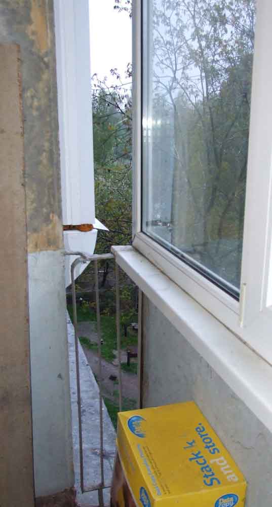 А может кто знает как избавится от такой дырки на балконе, и чем ее замуровать? И каким образом материал приклеить к концу рамы?