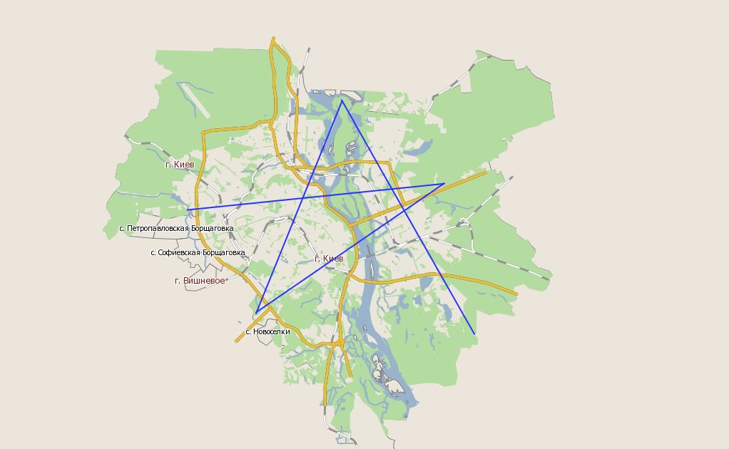 Наверно весь Киев не стоит предлагать, пять разнесенных точек дали 135 км по-прямой
