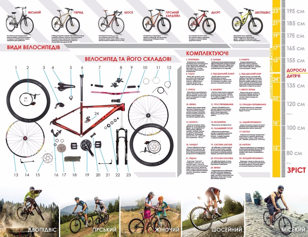 Дитячі велосипеди мають діаметр 12, 16, 20 та 24 дюйми; гірські – 26, 27,5 (650b) та 29 (700с) дюймів; гібридні і шосейні – 28 (700с). Хай вас не лякають математичні розбіжності. Посадковий діаметр 28 та 29 - дюймових коліс однаковий - 622 мм.