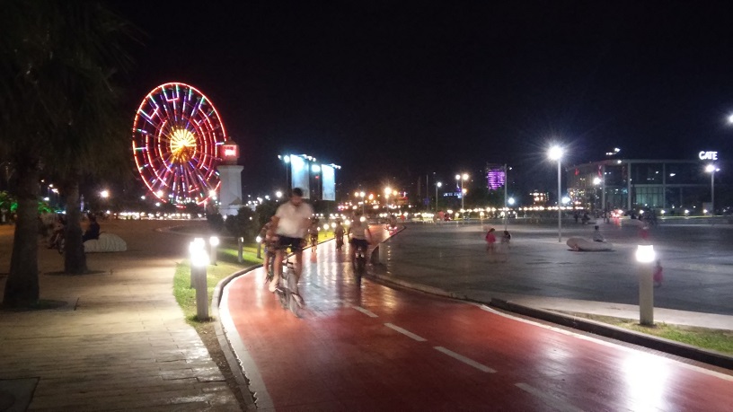 Дорога идёт вдоль моря. Половину пути от Батуми можно ехать по красной дорожке, которая расположена рядом с тротуаром. Дальше следует съехать на дорогу. Местные водители на удивление оказались более терпимы к велосипедисту чем наши (может это особенности национального трафика и менталитета).