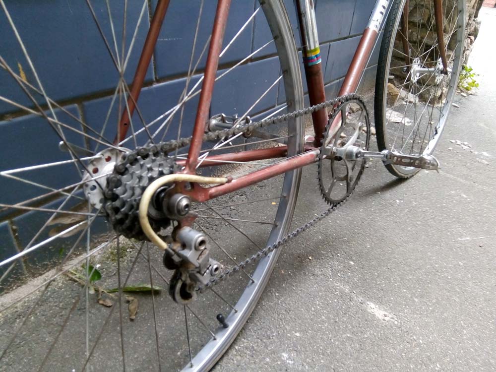 Рама ХВЗ, руль стальной Велман, ручки и тормоза ХВЗ, втулки высокий фланец ХВЗ, система и педали ХВЗ, переключатель задний ХВЗ, переднего нет, обода какие-то импортные (не Китай), покрышки Мишлен, камеры Китай, кассета 5 звезд Шимано.