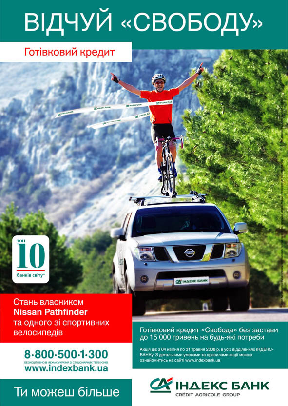 по моему скромному мнению, тело с велом на крыше внедорожника откровенно рекламирует паразитически неспортивный образ жизни от Индекс-банка. У меня, когда я эту рекламу вижу - неизменно рвотное чувство, особенно на финальных кадрах, когда нормально вкручивавшие, но приехавшие последними чуваки улыбаются в камеру, как будто так все и надо и их не тупо кинули папики и их сынулька-мажор...