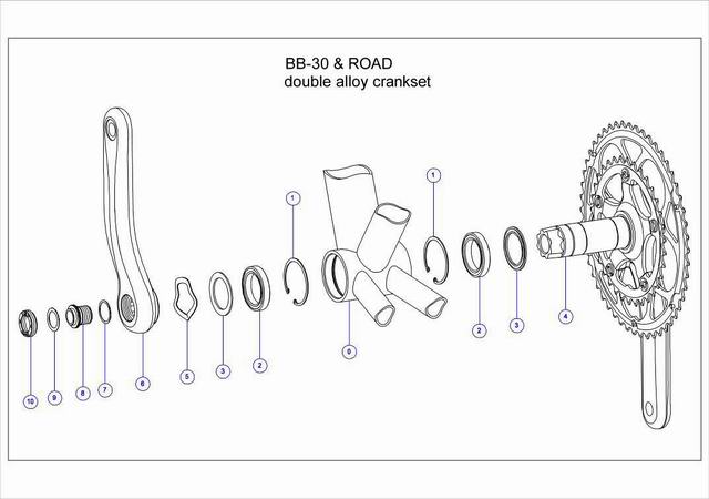 1 Circlip (Snap-ring) 2 BB30 Bearing 3 Bearing Shield 4 Right Crank Arm and Spindle