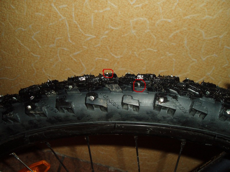 Надо набрать шиферных гвоздей (что это такое - я точно не знаю, хотя приблизительно себе представляю) и навтыкать их с внутренней стороны, причём между выступами протектора. По длине гвозди должны на 1 - 2 мм не доставать до верхушек протектора. Для защиты камеры от проколов просто вставить ещё одну камеру, разрезанную вдоль.