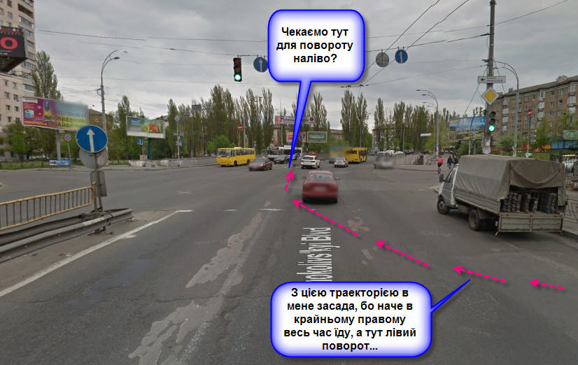 Ні, я їду з Гетьмана на свій зелений разом з усіма автомобілями. Чим вони мені заважатимуть??? Вони собі їдуть прямо, я теж прямо, але потім беру трішки вправо і зупиняюся нікому не заважаючи. Якщо ж з Гетьмана вже моргає жовтий - то їхати нікуди не треба, слід зупинитися на світлофорі й дочекатися зеленого - тоді буде максимум часу на маневр.