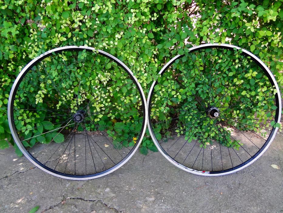Обода Mach1 CFX. Спицы - неизвестно. Задняя втулка Quanta KT - GT1R под 8/9 скоростную кассету. Втулка передняя Sora/Tiagra Shimano. По 36 спиц в колесе. Флипперы в комплекте Michelin. Тормозные дорожки в идеальном состоянии.