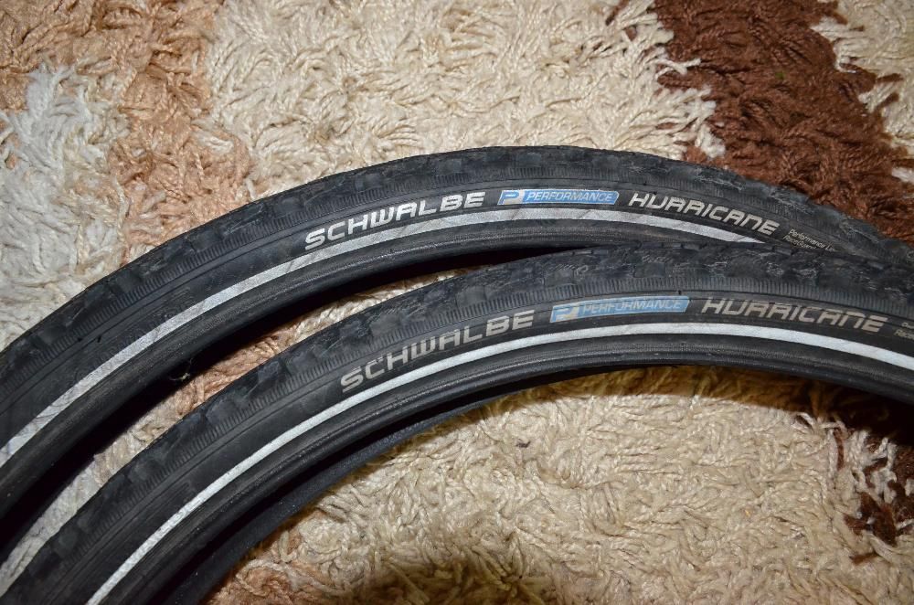 Schwalbe Hurricane 26х2,0 RaceGuard (4 уровень защиты), номер 2 на фото. Каталась 1,5 года, была установлена на заднем колесе. Есть поверхностный некритичный порез на протекторе длинной 1,5 см. Цена - 150 грн.