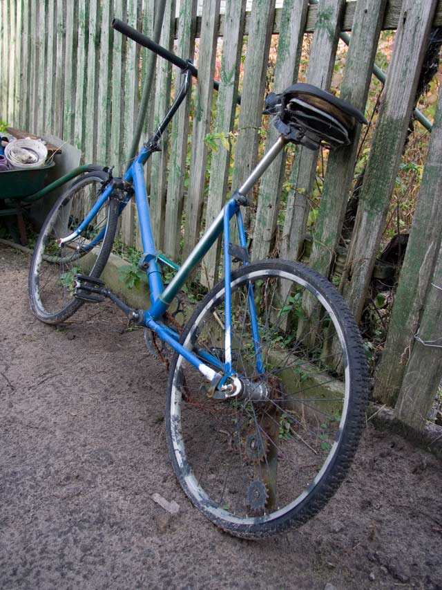 Зашел я как-то за угол дома, а там... любимейший синий апхилл-байк моего братика. Сколько сотен километров Боярских лесов на нём не пройдено... А смотрите, как молодой! Даже восстанавливать его не хочется. Пусть остается таким, какой есть, в оригинальной комплектации, ведь в этом весь смысл винтажности.